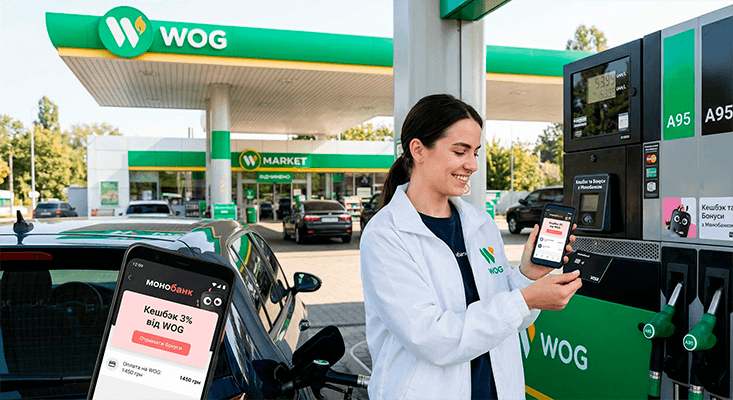 У застосунку monobank є вбудована інтеграція з WOG PAY (BOX) – сервісом безконтактної оплати прямо біля паливної колонки. Щоб ним скористатись, увійдіть у розділ «Ще» → WOG, прив’яжіть картку PRIDE та обирайте сорт пального, не заходячи на касу. Оплата відбувається через Shake to Pay або стандартний NFC. Кешбек при цьому також нараховується – адже саме цей спосіб позначений у назві партнерської пропозиції «через WOG PAY (BOX)».